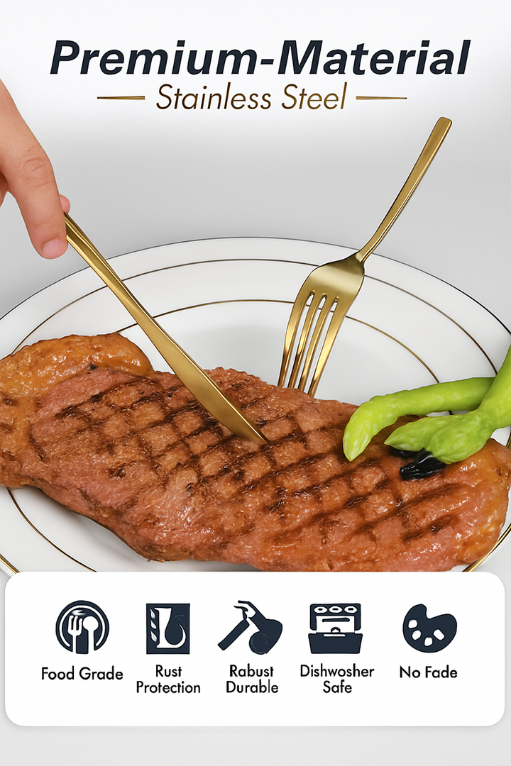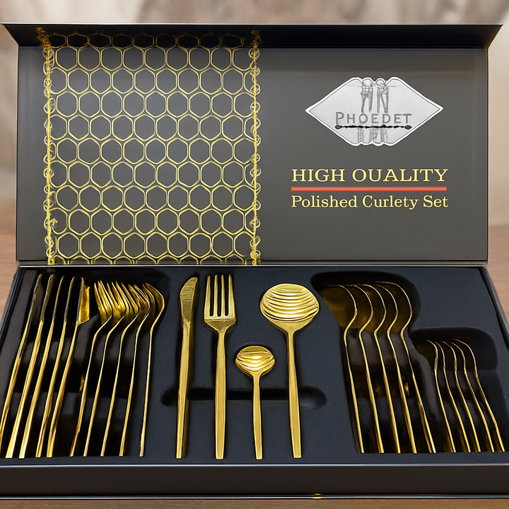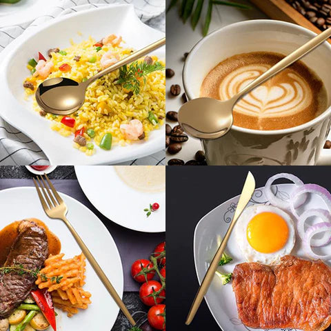 ✨ أضف لمسة فخامة وأناقة على سفرتك مع هذا الطقم الذهبي المميز، المصنوع بعناية من الستانلس ستيل النقي لمتانة تدوم لسنوات.