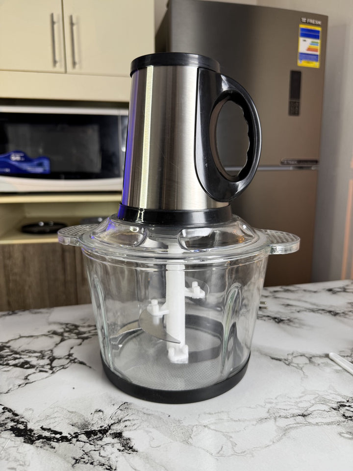 وعاء استانلس ستيل آمن على الطعام + وعاء شفاف مقاوم للكسر لمتابعة عملية الفرم بسهولة. -